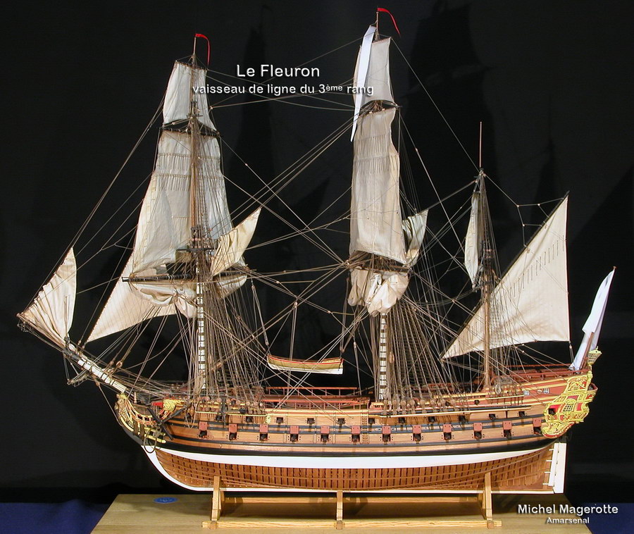 Lorsque j’ai décidé d'entreprendre la construction du vaisseau de 3ème rang ˝ Le Fleuron ˶ issu de la monographie de Gérard Delacroix, tout était fait pour me séduire dans ce bâtiment. Il était en effet le représentant d’une époque de transition où se mêlaient les modernités et les archaïsmes. De plus, le vaigrage oblique du Sieur Gobert et le décor remarquablement équilibré de Charles-Philippe Caffiéri m’intéressaient tout particulièrement.
